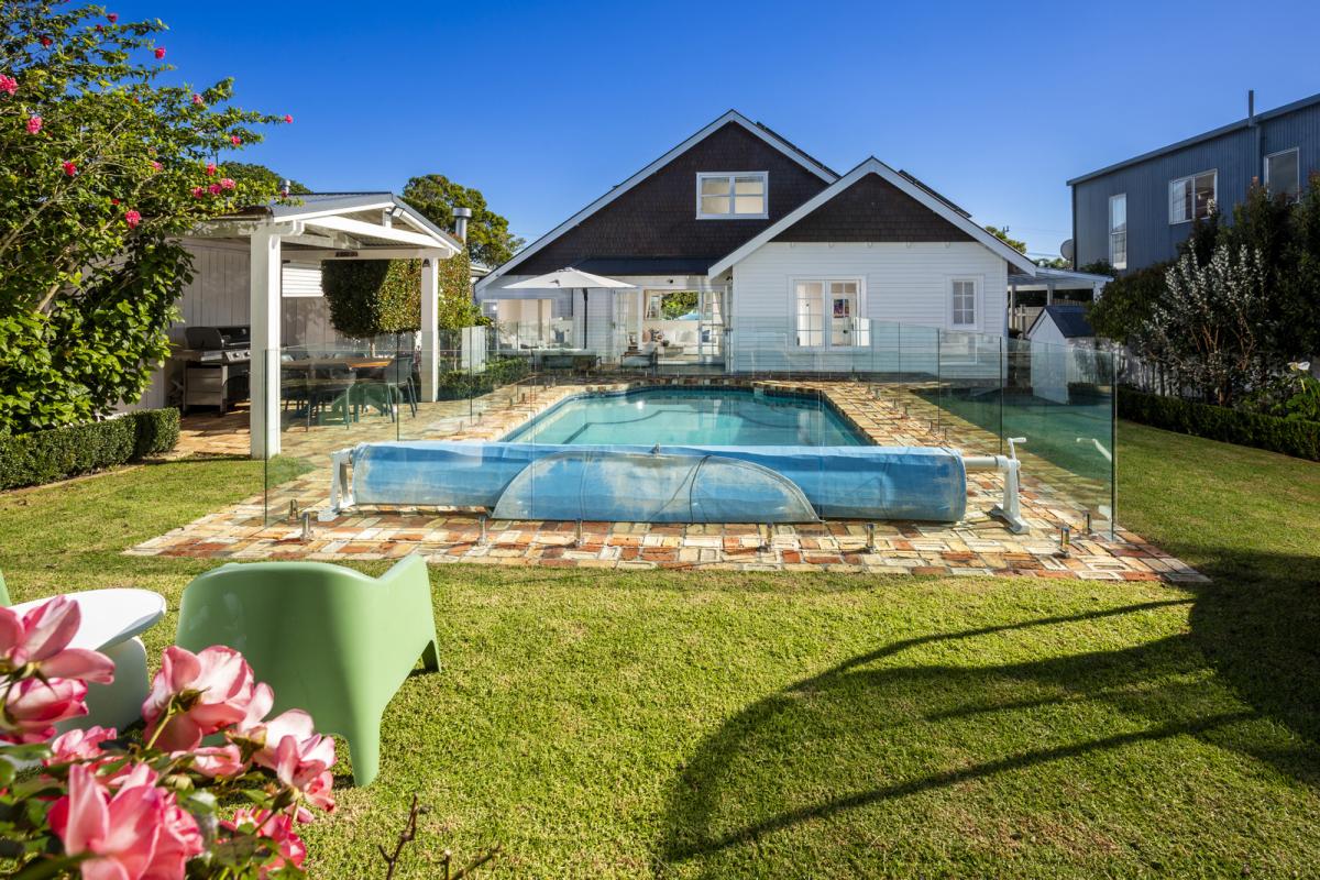 The rear garden is an entertainer’s dream, with a heated swimming pool and grass lawn area surrounded by established gardens. A covered barbecue area, outdoor wood fire, and generous dining space create the perfect setting for relaxed alfresco living.
