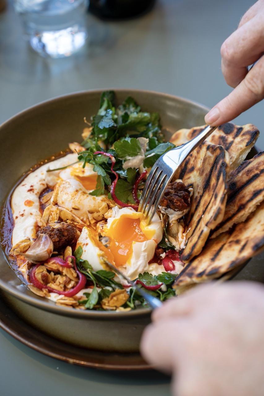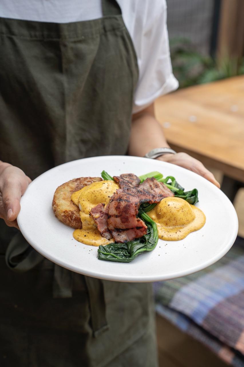 I’ve dined twice at Gather recently for brunch while out walking the dog with family. I love that Gather is dog-friendly, with four-legged friends welcome in the wonderful arbour of the eatery. On my first visit, I had their eggs on toast. These are ‘dippy eggs’ (soldiers) with smoked butter, house pickles with house-made focaccia bread (or seedy rye). Yum! Trip two, I decided on the Farm Big Breakfast Plate – two eggs, merguez sausage, bacon, harissa portobello mushroom, baked beans, sauerkraut, smoked butter, breads… a sizeable breakfast for champions!