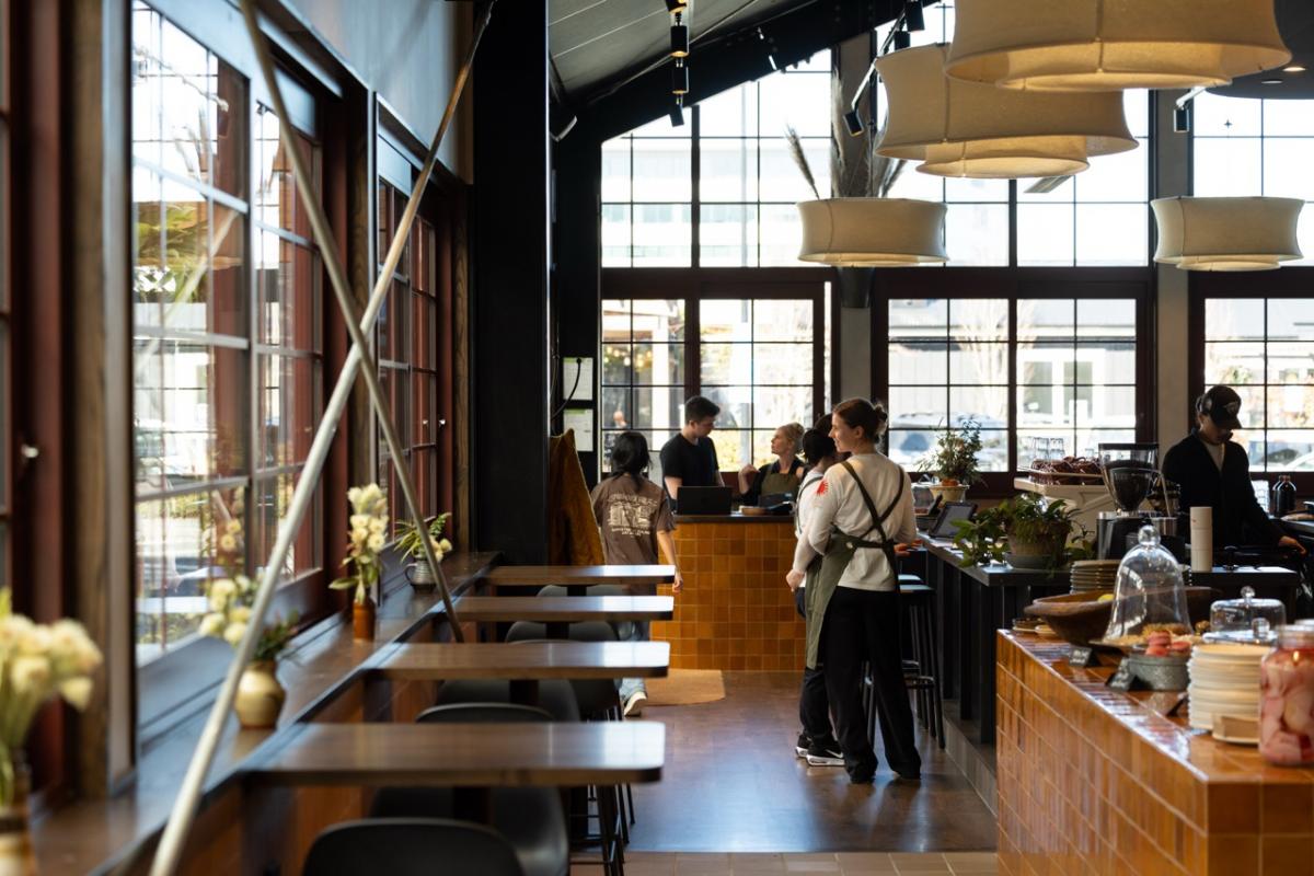 What a fantastic addition. Gather has its home in a purpose-built glasshouse building located between the B:Hive HQ and B:Hive+ near the pedestrian crossing and Shorecare. It’s been impressively designed by Izzard Design studio, featuring a recycled French brick exterior and expansive red scoria glass windows. The interior design is by Jonathan Goss and Amy Melchior, who’ve created a beautiful, inviting space with handcrafted details and natural textures. It will win awards!