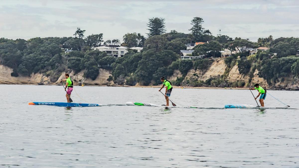 He says he “very loosely” belongs to the casual Cheltenham Paddleboard Club, which has “largely faded of late as everyone has gone wingfoiling instead”. He mostly trains, two to three times a week, from home in Bayswater and with the Takapuna SUP group at Takapuna Beach.